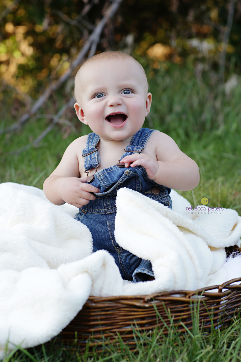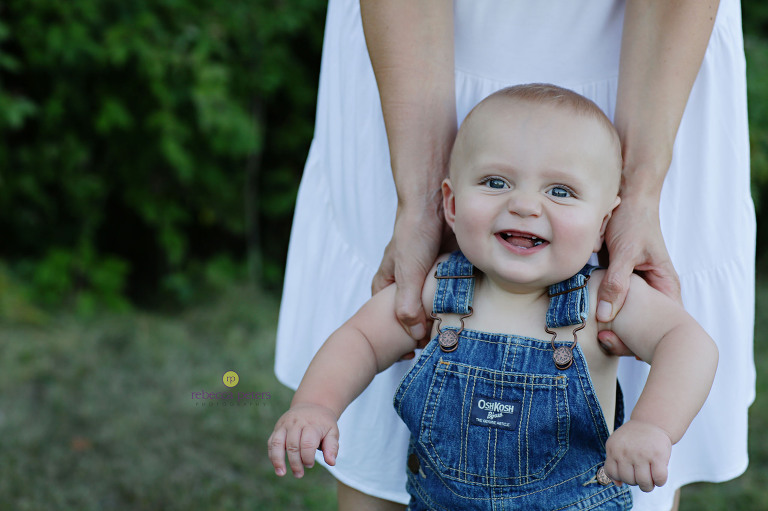 I wish I had audio from this session — because Henry’s Mom is so creative with lyrics, he had his own music sung to him to help get those smiles! Â It’s basically a song about Henry being an adorable chicken nugget… 🙂 Â I loved it, and told her she might be missing her calling! Â Henry had the best session…tons of smiles, nice weather (a few gnats, but still) and those sweet baby overalls. Â Hard to believe he’s already 8-months old. Â Only one more session left on his First Year Program!