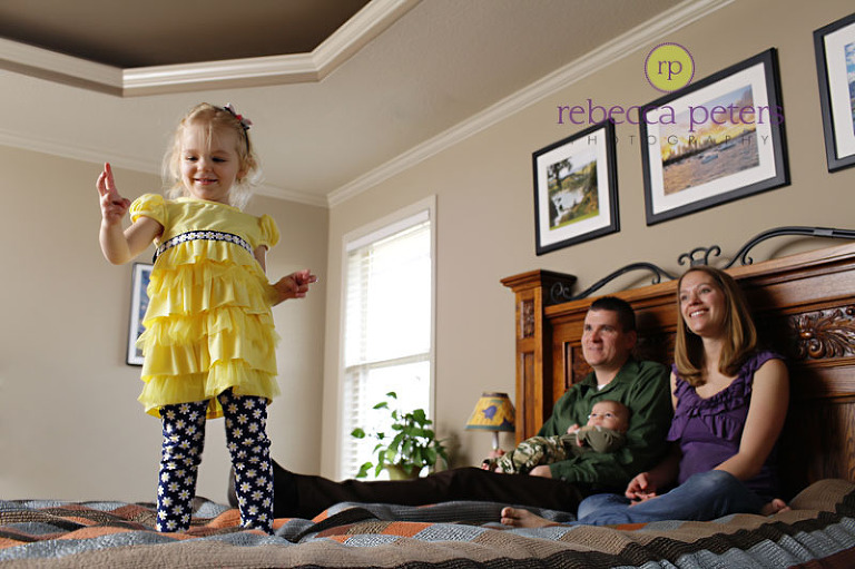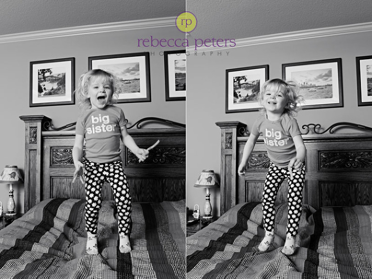 At Jacob’s newborn session, right as we began big-sister Lizzie wasn’t feeling so well. So I worked with Jacob for a little while, and we planned a second time to work with the whole family! Well that date arrived, and Lizzie was WONDERFUL! She is just amazing with baby-Jacob — so gentle and sweet. I loved photographing them together. And she was full of energy for some jumps on the bed, and showing me her favorite stuffed animals in her big-girl room. I love this family, and I’m so happy for their latest addition!