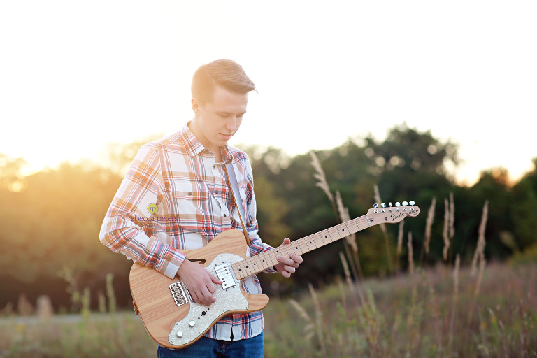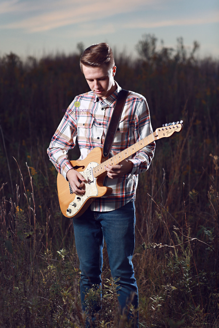 I just love when a Senior is open to any location that I’d like — and that’s just what Cody did.  I knew I wanted him to have some slightly-urban, but then nature as well!  So downtown Olathe made the most sense, where we just wandered around and found some amazing little alleys/spots…then it was Southbound to a little-known park to include some grasses/glorious sunset!  My favorite was at the end when he brought out his guitars.  Such a talent!!  I had to play with some lighting too…and he rocked it.  Thanks for trusting me on your session Cody, you were a blast!
