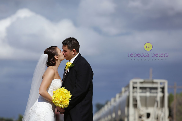 The morning started off a little overcast, but it appeared to be moving away from us. The girls got ready, Ashley & Michael shared a sweet First Moment, and the ceremony began. When it was time for the exit, the sun was out and shining! Perfect for their convertible-exit… :) After getting the wedding party to our first spot, I position the bride and groom and suddenly the sky opened up on us. It was insane! I handed them an umbrella, and after a few moments we took cover to wait it out. It only took a few moments, and after that spot was completed Michael swooped Ashley off her feet and carried her back to the bus…it was awesome! Michael works for the railroad company, so we had to include the trains/train-tracks out there. Very fitting! They celebrated well into the night, and it was a super-fun day. I know she is sitting at her computer right now just waiting to see…so let’s get on with pictures!